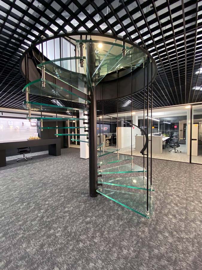 Základom je nosná konštrukcia, okolo ktorej sú napájané sklenené schody do oblúka. Najmä pre ich kompaktný dizajn sústredený okolo jedného pólu. Pri pohľade zhora, vytvárajú dokonalý kruh, špirálu, preto ich nazývame aj špirálové schody.